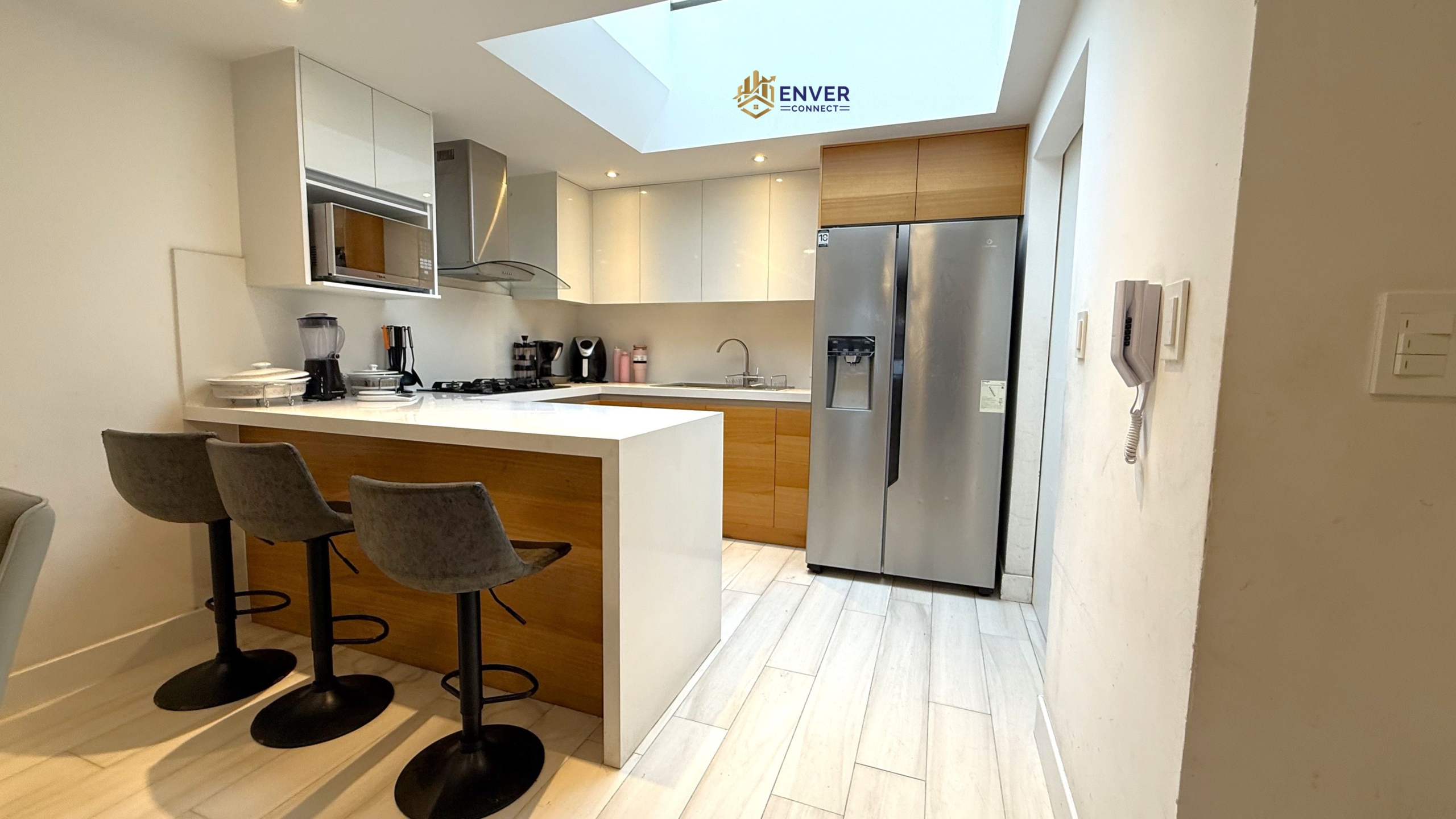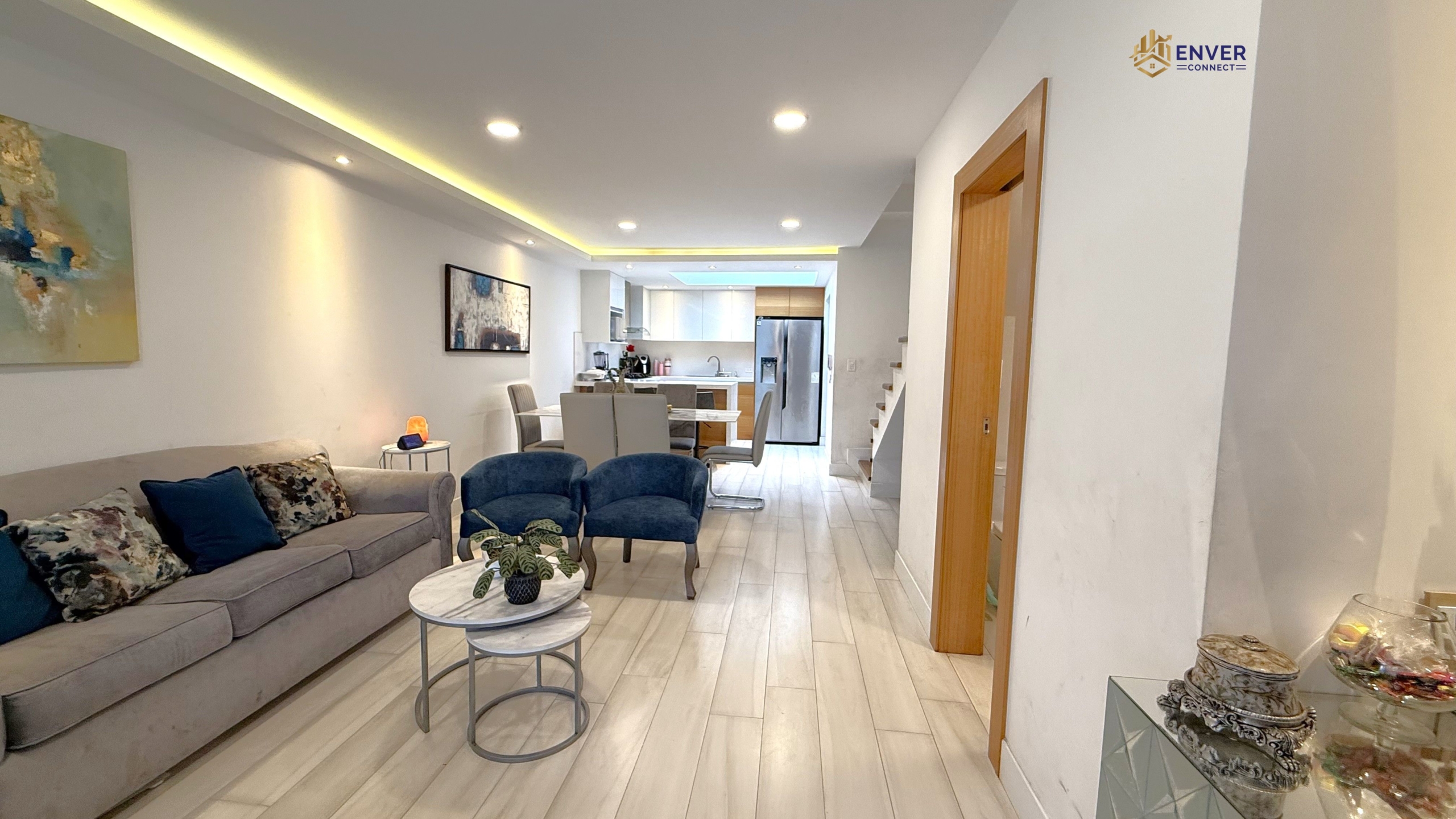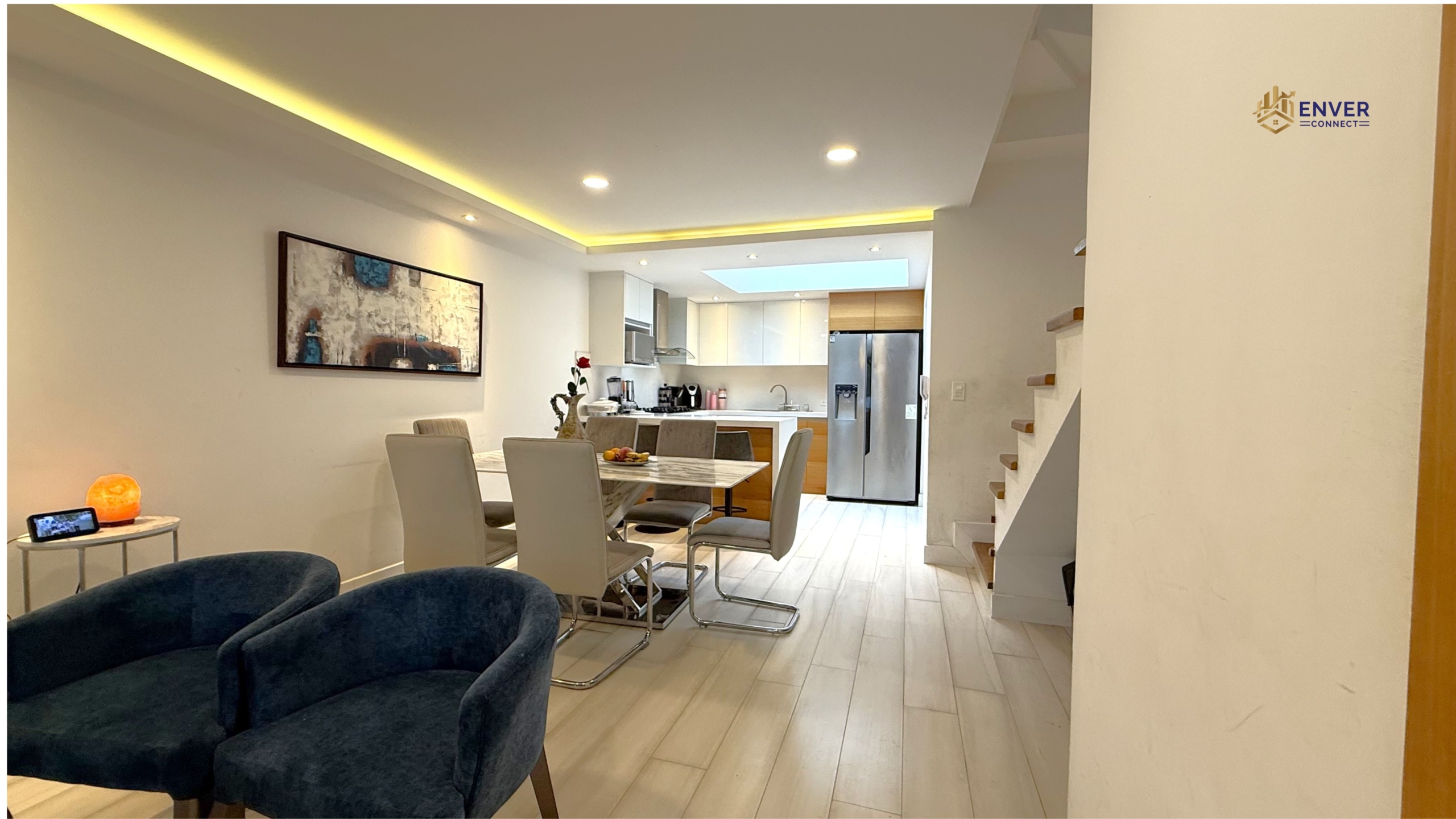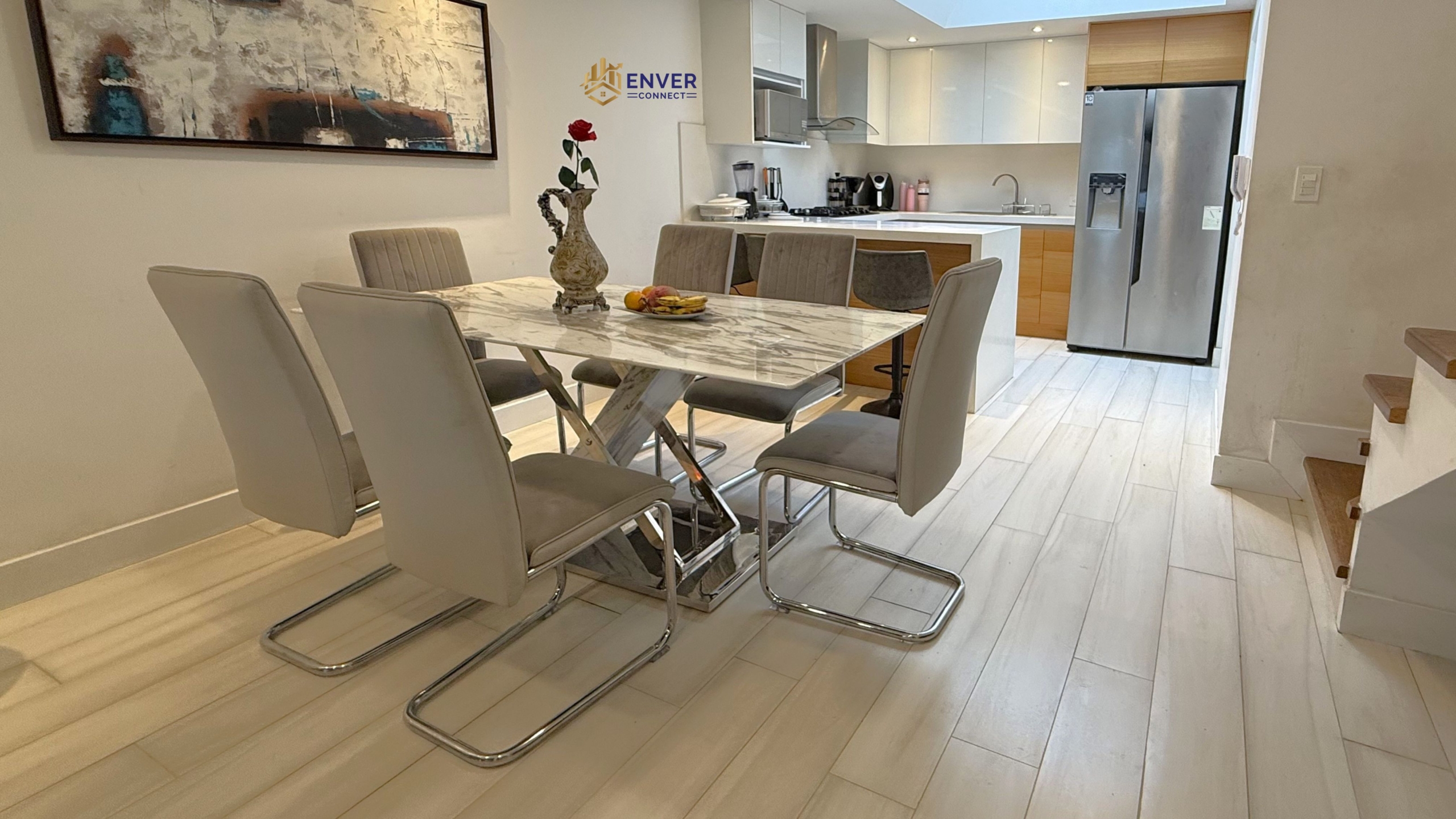 Sala, comedor, cocina, baño social, área de lavandería.