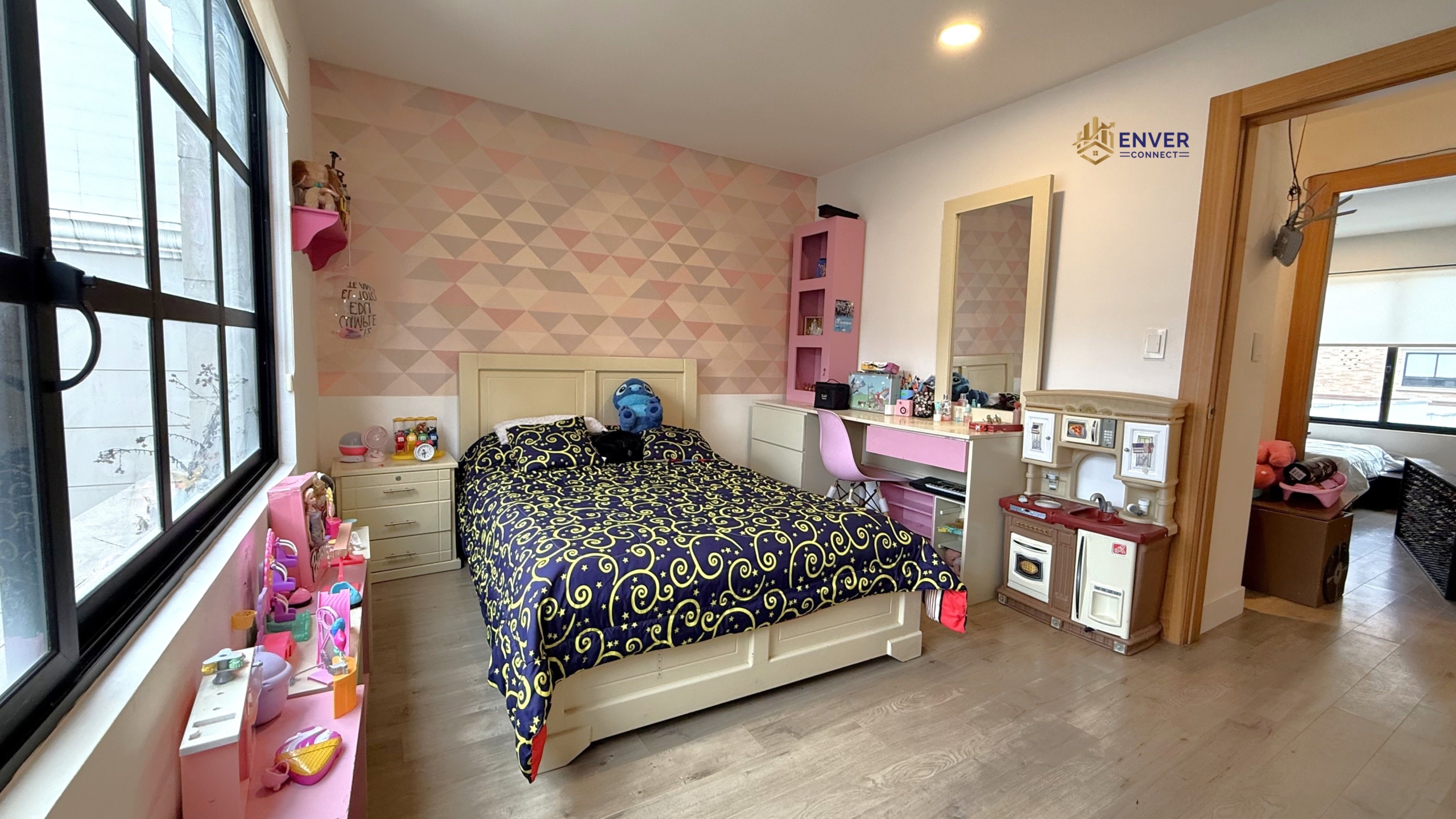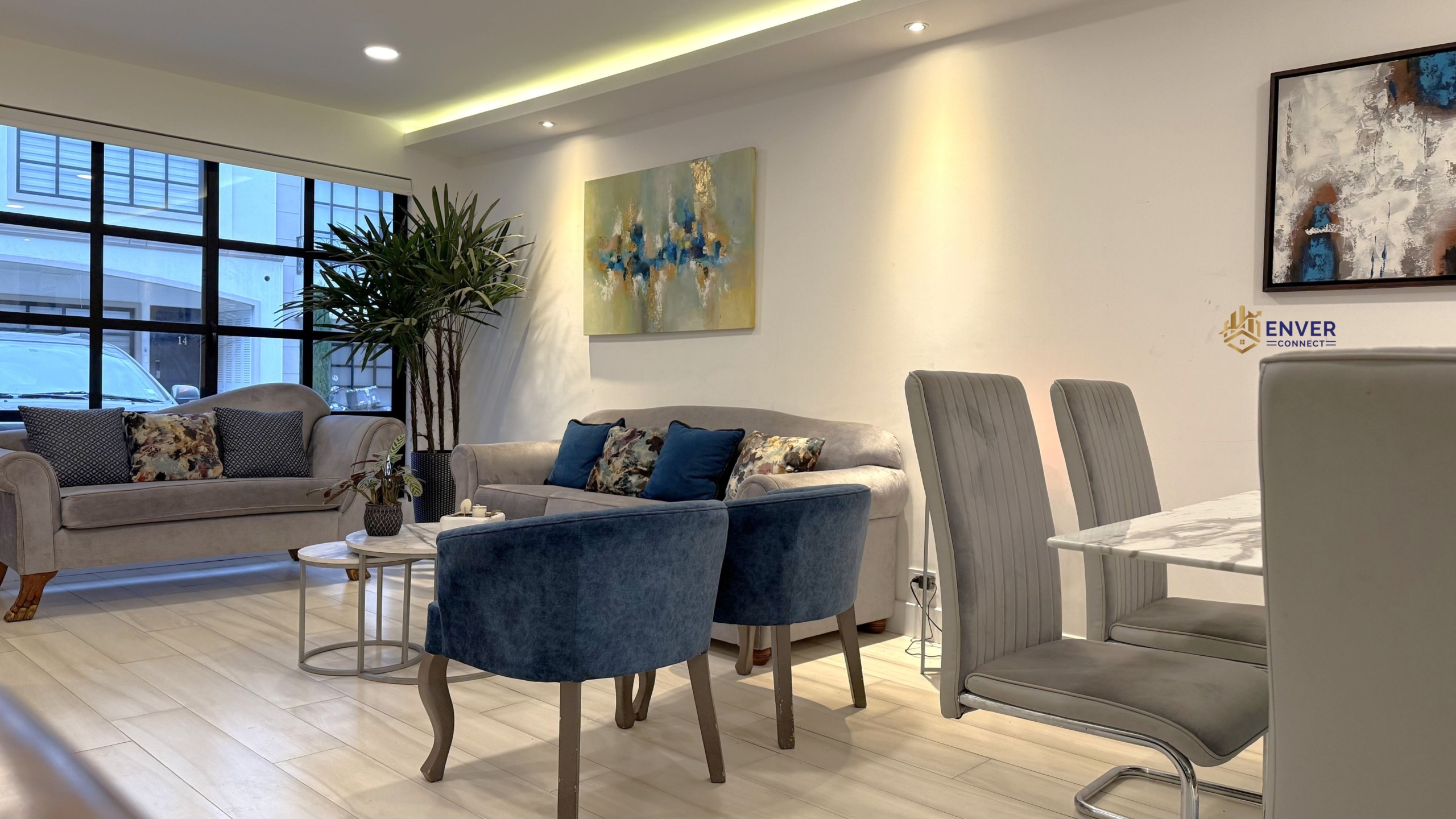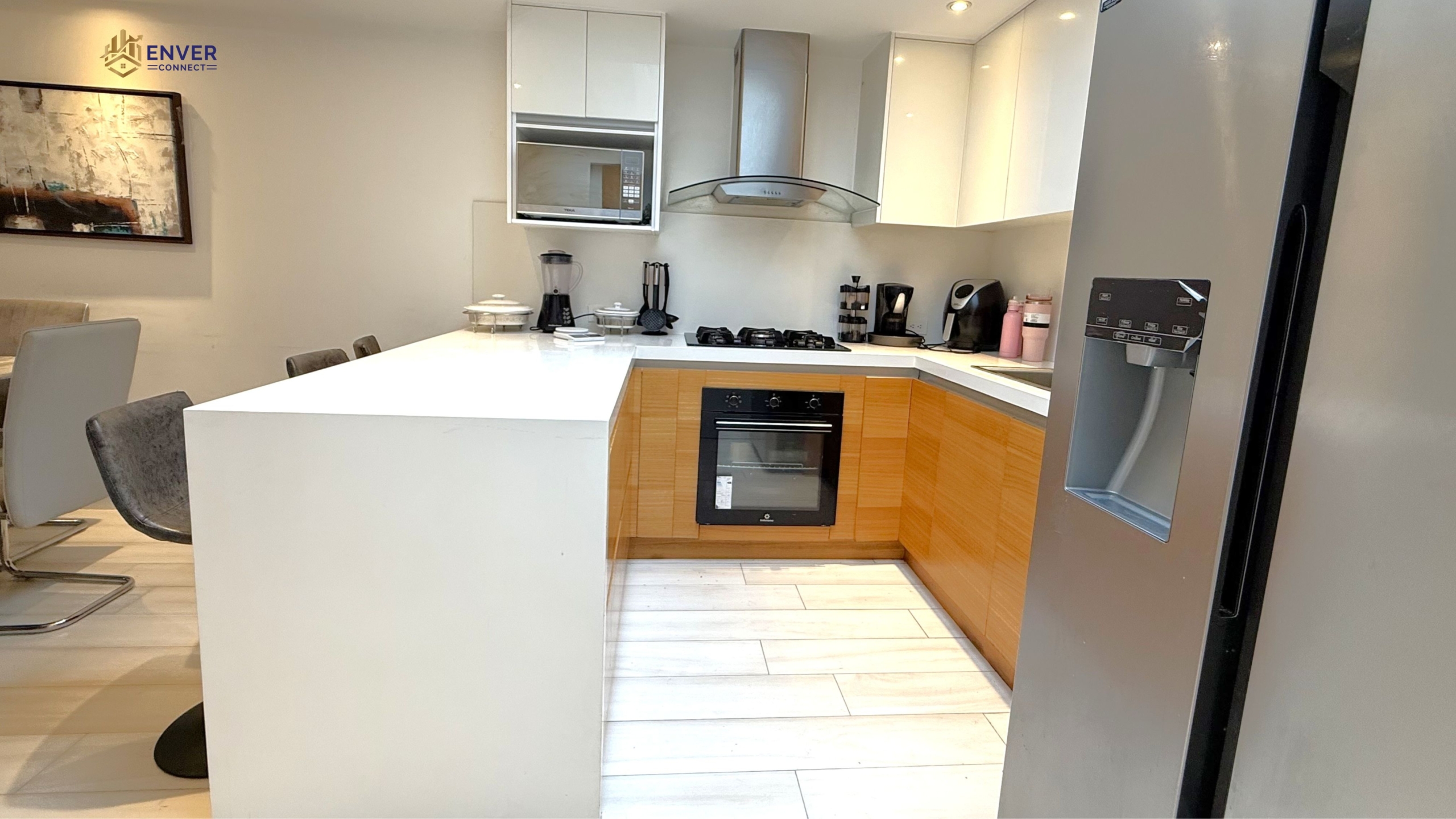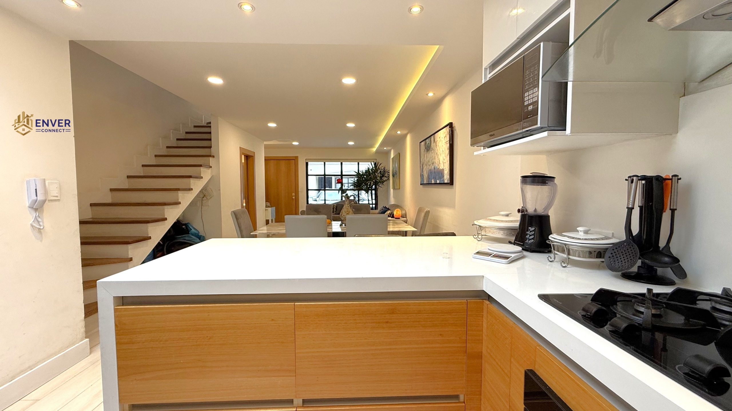 Sala, comedor, cocina, baño social, área de lavandería.
